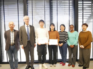 清水 翔也さん(昆陽研究室 博士後期課程2年)、久保田 采佳さん(山田研究室 博士後期課程2年)、岡 佑依さん(齊藤研究室 研究室 博士後期課程2年)、葉 夢宇さん(鈴木研究室 博士後期課程2年)、平間 草太さん(大関・OU・杉山・笹尾・本多研究室 博士後期課程2年)、牧本 久樹さん(岡谷研究室 博士後期課程3年) 第34回博士後期課程学生発表会ベストプレゼンテーション賞に決定