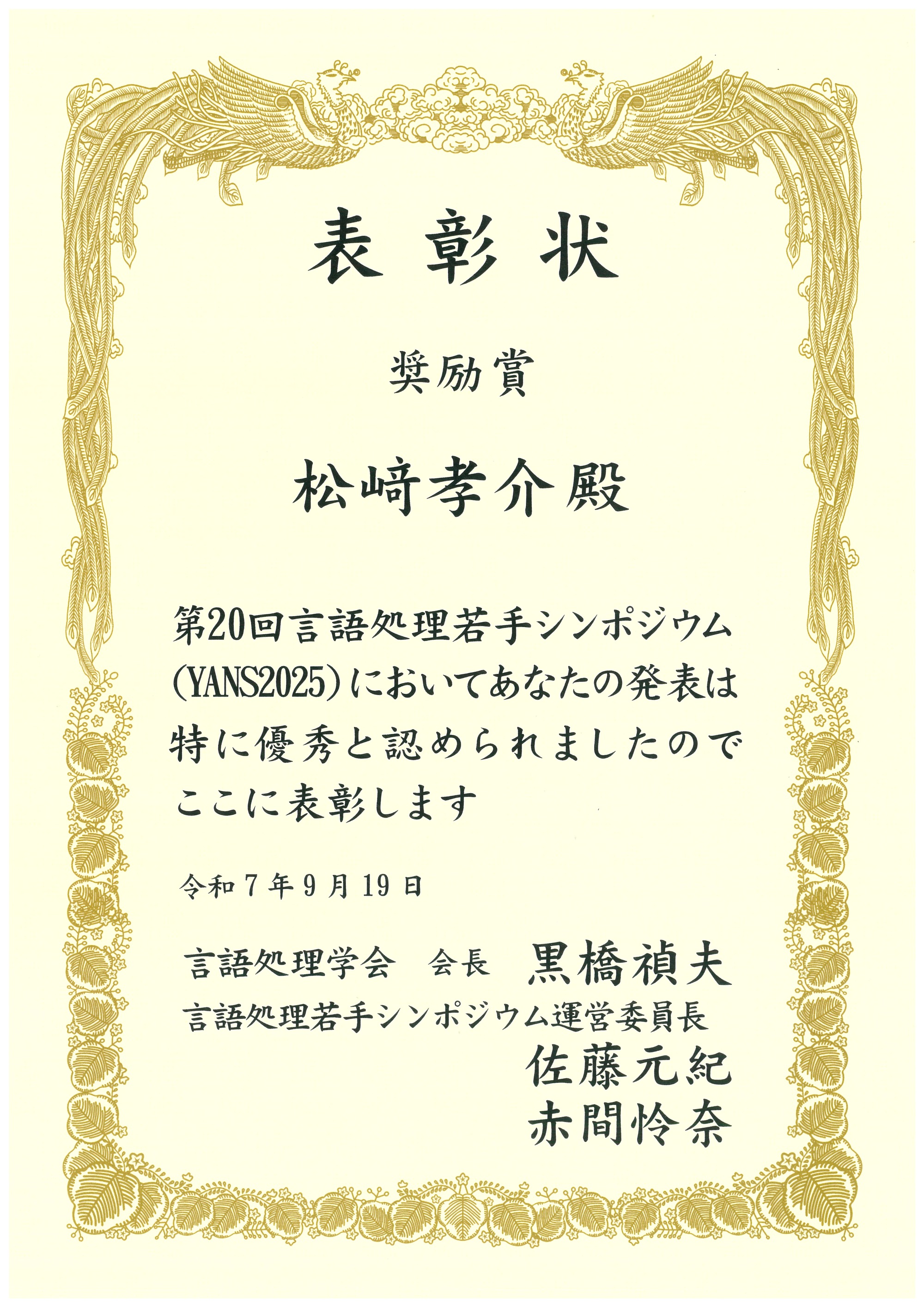 システム情報科学専攻 坂口・乾研究室の松﨑孝介さん(博士前期課程2年)が、2025年9月17日から19日にかけて開催された第20回YANSシンポジウム(YANS2025)において奨励賞を受賞しました。