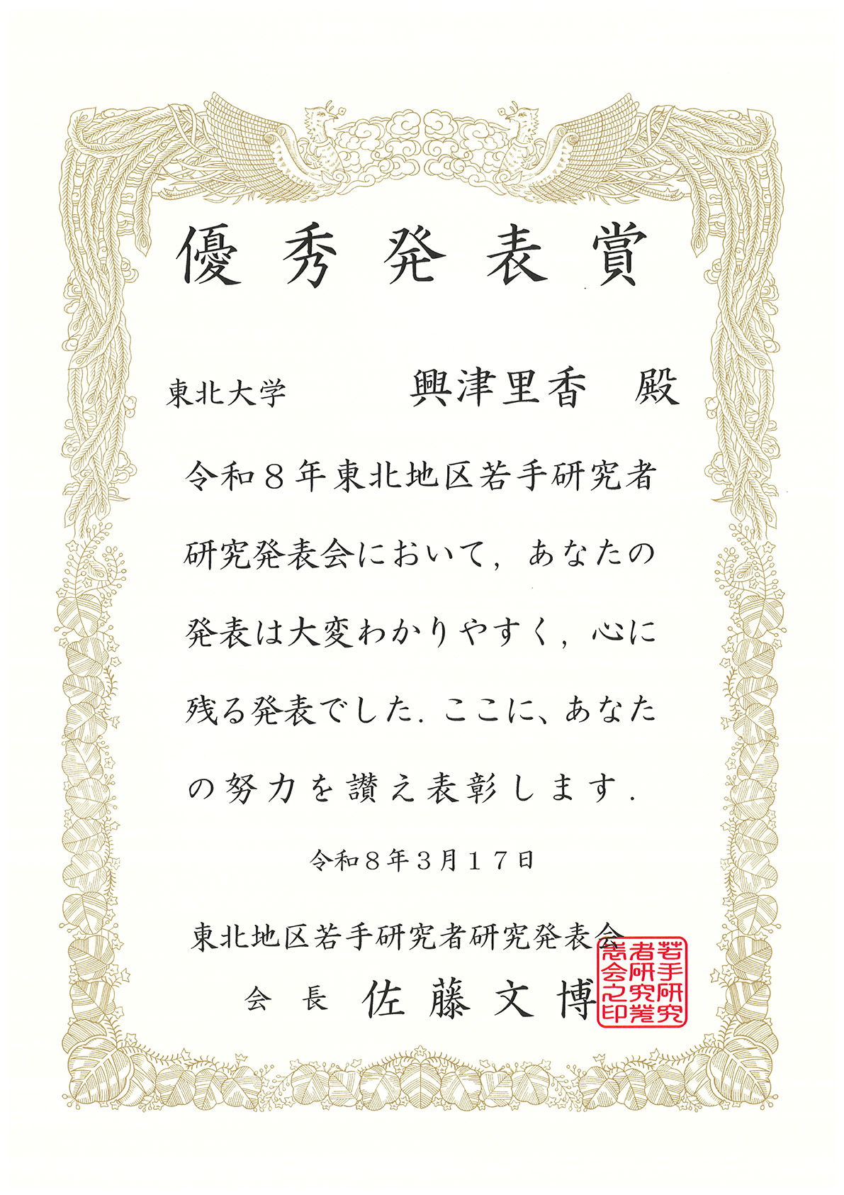 ・賞名:東北地区若手研究者研究発表会・優秀発表賞