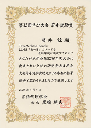 藤井 諒 (情報科学研究科 社会人博士課程/フューチャー)が言語処理学会第32回年次大会(NLP2026)若手奨励賞を受賞