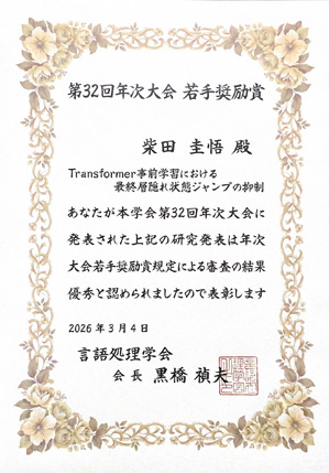柴田 圭悟 (情報科学研究科 博士前期課程1年)が言語処理学会第32回年次大会(NLP2026)若手奨励賞を受賞