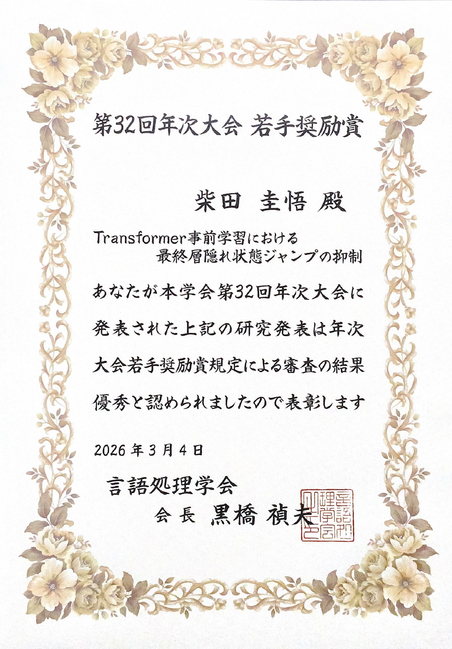 鈴木研究室の柴田 圭悟さん(博士課程前期1年)が、2026年3月9日から13日にかけて開催された言語処理学会第32回年次大会(NLP2026)において下記の発表を行い、若手奨励賞を受賞しました。