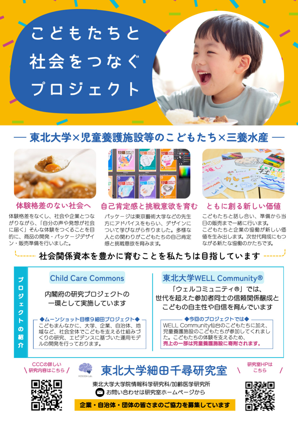 東北大学大学院情報科学研究科・細田千尋研究室は、2026年4月19日開催のSendai Coffee Fes 2026に出展し、児童養護施設のこどもたちおよび三養水産と共同で開発した商品の販売を行いました。子どもが「ケアされる側」から「社会と共創して価値を生み出す側」として、企画・開発・販売の全行程を担ったこの取り組みは、日本経済新聞に掲載され、NHK「てれまさ」でも紹介されました。